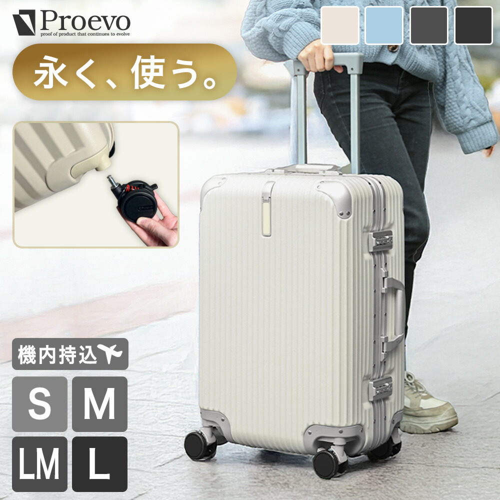 日本ブランド「Proevo」が国内企画・設計したアルミフレームタイプのスーツケースです。楽天市場では、現行モデルと新モデルの2つから選択可能。高い強度で荷物を守り、静音8輪キャスターはストッパー付きで移動も快適です。ボトルホルダーやスマホホルダーを備え、手荷物をスマートに管理できます。両面仕切り(※1)やメッシュポケットなど内装も充実。キャスターが取り外し可能で、取り換えできるので長く愛用できるのもうれしいポイントです。